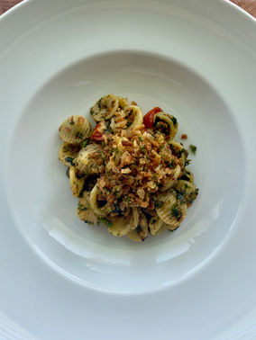 Pasta met ui-knoflook saus en gevulde biefstuk